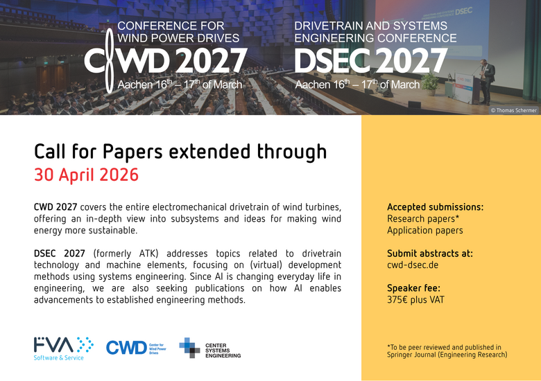 The Conference for Wind Power Drives (CWD) and the Drivetrain and Systems Engineering Conference (DSEC) will be held from 16 – 17 March, 2027 in Aachen. This event promises to be a hub of knowledge and collaboration in the exciting fields of Drivetrain Technology, Systems Engineering, and Wind Power Drives.